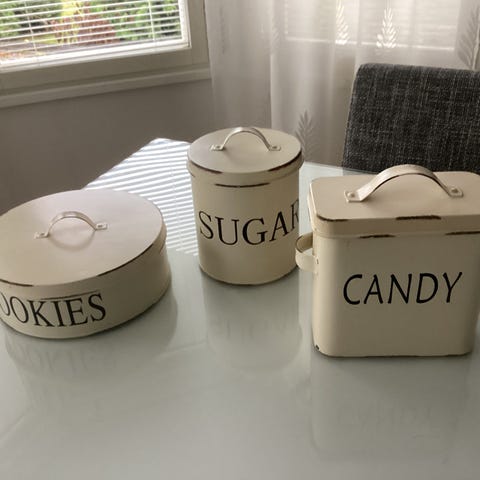 Peltiset säilytysastiat kekseille ja suklaalle. Halvalla pois nurkista. Nouto tai Toridiili.