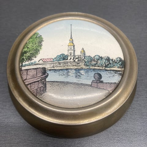 Antiikki korurasia keramiikkaa messinki koristeilla