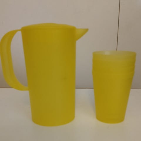Kirkkaankeltaiset vähällä käytöllä olleet muovimukit. 2,5 dl tilavuus.
