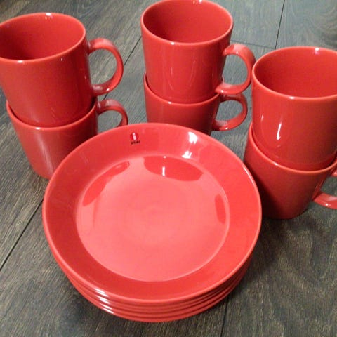 Uudet ja käyttämättömäksi jääneet Iittalan Play sarjan pinkki-oranssi muki 0,35L, lautanen 22cm, kulho 13cm ja iso kulho 19cm.