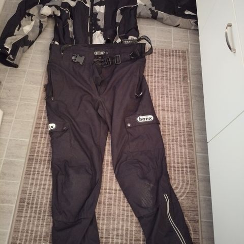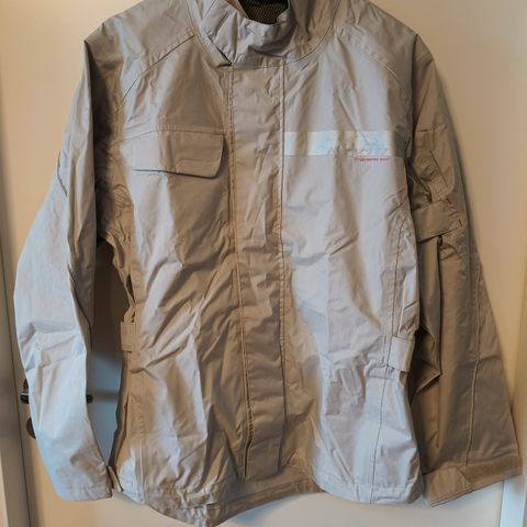 Hanxin sadetakki ajokamojen päälle. Takki menee hyvin ainakin 48 ja 50 -kokoisten takkien päälle, jonkin verran joustava ja runsas mitoitus niin voi mennä isommillekin.