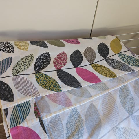 Eli: kankaan koko pituus 245 cm, josta 70 cm osa yläreunasta koko kankaan leveys 145 cm ja noin 175 cm pituinen osuus 77 cm leveä.