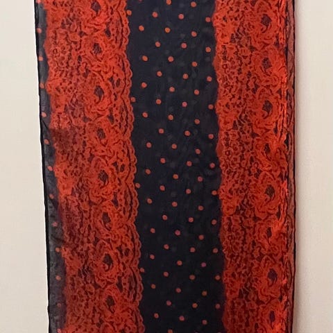 Noin mitat- 165cm pitkä, keskellä leveys 24cm. Pitsiosuus leveys 32cm edessä molemmin puolin.