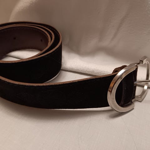 Leveä musta nahka vyö 1970- 80 luvulta. En tiedä onko käytetty kertaakaan? Siistissä kunnossa. Leveys 5 cm, koko vyön pituus noin 110 cm.