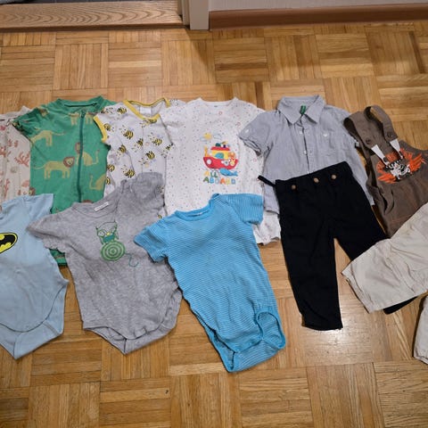 Vaatteet ovat hyvässä kunnossa. Yhdessä bodyssa ja toisissa leggingsissä on tahroja (näkyy kuvassa). Koko 12 kk.
