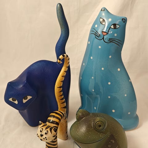 Tämä persoonallinen ja värikäs keramiikkakissa on peräisin Meksikon Tonalá-alueelta, jossa on pitkät perinteet folk-taiteen ja käsinmaalatun savikeramiikan valmistuksessa. Kissan koristeellisessa pinnassa nähdään lintumotiiveja ja geometrisia kuvioita murretuissa sävyissä – ruskeaa, vihreää, valkoista ja harmaata. Ilmeikäs katse ja tarkka viivakoristelu tekevät siitä taide-esineen, joka vangitsee katseen missä tahansa tilassa.