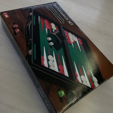 Myydään kuvan mukainen Backgammon lautapeli. Kaikki osat ja ohjeet tallella ja erittäin hyvässä kunnossa. Laatikon pinnassa kulumaa.