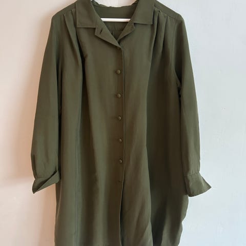 Oliivinvihreä kauluspaita. Joustaa aika hyvin. Merkki Amisu ja koko L.