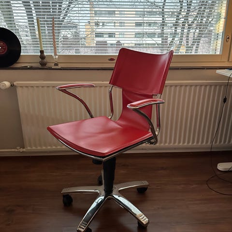 Erittäin tukeva, painava ja istuinosan korkeutta säädettävissä oleva tuoli 1980- luvulta. Korkeus maasta selkänojaan 80 cm, istuin on ala-asennossa Selkänojan korkeus istuinosasta 35 cm. Selkänojassa toisella sivulla on nojapuun murtuma, mutta on liimattu tukevasti.