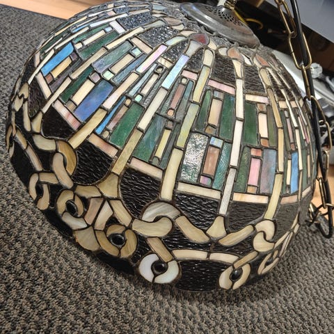 Tiffany-valaisin, koristeena hedelmiä ja lehtiä. Kaksi lamppua ja sähköistys. Varjostimen korkeus on 30 cm, pituus 60 cm ja syvyys 40 cm.
