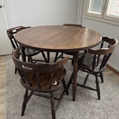 Puinen pöytä (mänty), koristeelliset jalat. Ikean Lidås tuoleja 4kpl