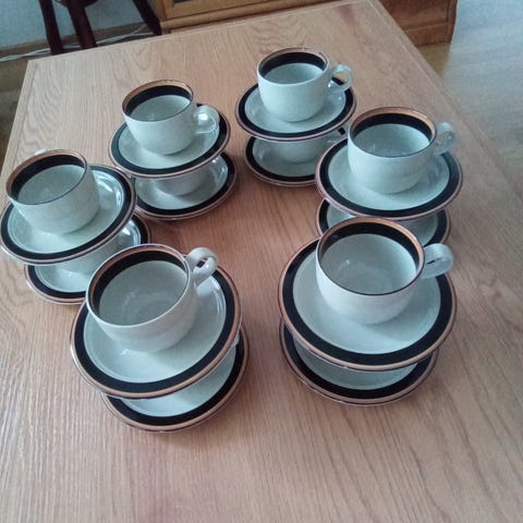 Myydään Arabian Usva kahvikuppeja neljä (4) paria pullavateineen (kuvassa oikeanpuoleinen setti).