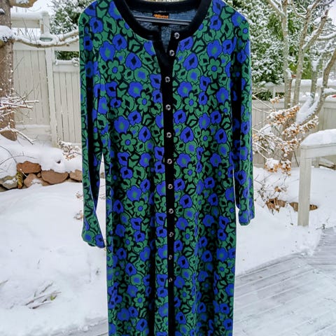 80-luvun vintage mekko, edessä napitus ja kuminauha vyötäröllä, vyötäröllä myös pienet vyölenkit, joihin saa halutessaan kapean vyön. Ei kokolappua, mutta mittojen puolesta sopii 80-90cm vyötärölle ja rinnanympärys 113cm asti (kai-kai tässä 57cm). Olka-helma mitta 102cm. Mekossa lappu Made In England, ostettu vintagekaupasta Britanniassa.