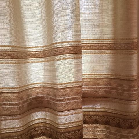Hyvin ohut valkoinen verho, jossa ruskeasävyisiä kuvioraitoja. Retro kuosi.