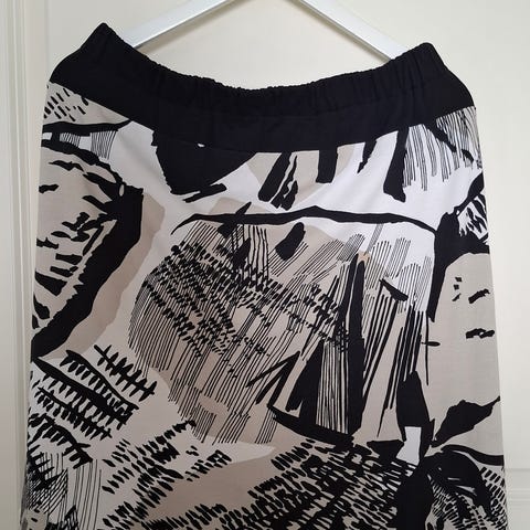 Värikäs kesäinen hame. Vyötäröllä kuminauha, venytetty mitta 100 cm., venyttämättä 82 cm. Kuminauhalla voi säätää pienemmäksikin halutessaan.Helmassa pieni halkio. Pituus 83 cm. Kangas ei jousta. Nouto/kulkeutuu omien menojen mukaan / postitus ( kulut ostajalle)