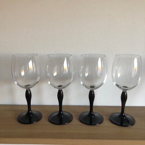 Myydään 4 kpl mustia, tyylikkäitä viinilaseja. Kulmikas muotoilu. Konepestävää lasia. Vetoisuus piripintaan 2,5 dl. Hinta koko setille (4 kpl).
