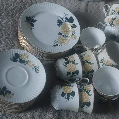 Sisältää kaksi lasia, 4 pientä kulhoa, yhden kolmen osaston tarjoilulautasen, kolme otin haarukkaa