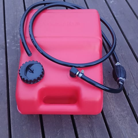 Alumiininen veneen tankki. 11.5 litraa. OMC -merkkinen. Kuvissa likainen, kunto hyvä.