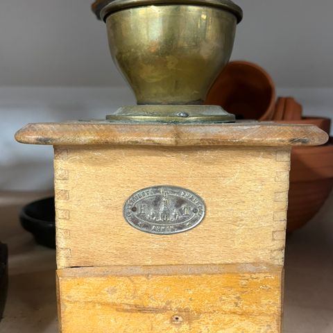 Vanha, söpön vaaleanruskea kahvimylly. Ollut itsellä vain koristeena, mutta vaikuttaa toimivalta. Pinnassa patinaa ja nyt huomasin, että kannen reunaa on ehkä liimattu oikealta.