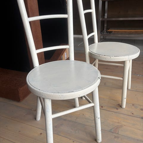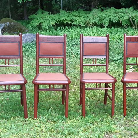 Muurame tuolitehtaan valmistamat antiikki tuolit, jotka joskus saaneet punaisen maalin pintaansa ja varmasti myös verhoiltu uudestaan. 😊