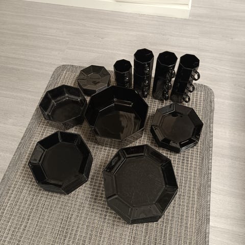 Neljää eri kokoista/syvyistä lautasta, kahvikupit sekä pikarit