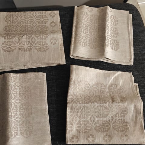 6 kpl todella kauniita lautasliinoja, voi käyttää myös tabletteina. Ei pesulappuja, mutta selvästikin pellavaa. Luultavimmin käsinkudotut. Vaikuttavat aivan käyttämättömiltä. Liilaa ja luonnonvalkoista. 35x35cm.