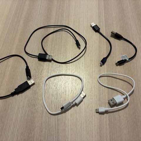 USB-A liitinjohtoja eri pituuksilla ja toisen pään liittimillä kuten USB-A uros, USB-mini uros, USB-Micro uros, USB-A uros-USB naaras ym. Haettuna kukin johto 1 €.