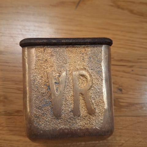 Metallinen prässätty tuhkakuppi. Päältä hapettunut enemmän ja pohjasta vähemmän.