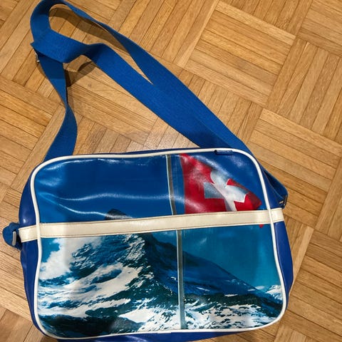 Musta olkilaukku, joka voidaan sulkea vetoketjulla. Sisällä on myös yksi tasku vetoketjulla. Laukun mitat ovat n.51cm leveys ja korkeus 35.cm. Letitetyt hihnat, yksi pitkä olkahihna ja kaksi lyhyttä. Laukku on vuorattu mustalla kankaalla, pitää tavarat korissa. Laukkua on käytetty, siinä on ajan ja käytön patinaa. Sisäosa on ehjä ja siisti. Laukku on 80-90 luvun Vintage. Tehty Kiinassa.