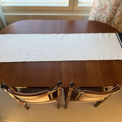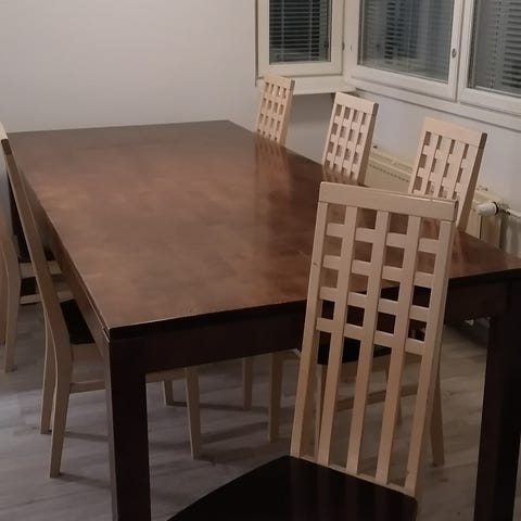 Täyspuinen ruokapöytä ja 6 kpl erittäin hyväkuntoista nahkatuolia. Pöydän pinnassa pieniä käytön jälkiä muuten kunto loistava. Voidaan myös myydä pöytä erikseen.