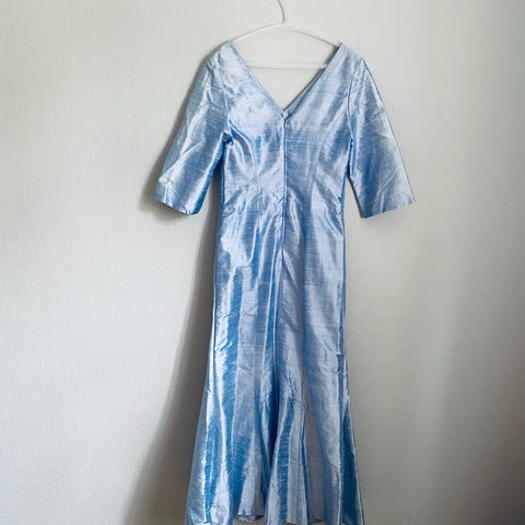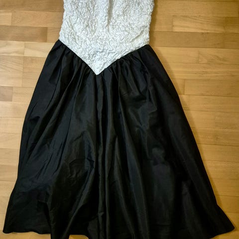 Isotädin peruja oleva juhlamekko, tummanharmaata raakasilkkiä. Pääntien ympärillä kimaltavat somisteet. Kyljessä on piilovetoketju.