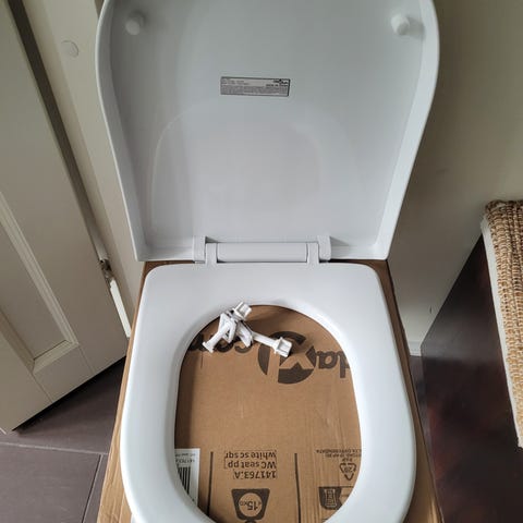 Uusi seinämallin pönttöön sopiva kansi. Paketti on vain avattu ja todettu vääränlaiseksi itselle.