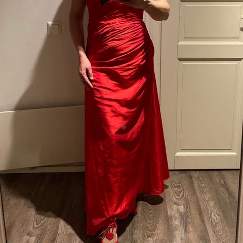 Viininpunainen ilta-/juhlapuku, koko M. Koko hieman nafti, menisi varmaan S-kokoisellekin. Siistissä kunnossa, helma vain hieman pölyinen ja rypyssä säilytyksen jäljiltä. Kuvissa käyttäjä 169cm, ilman korkoja.