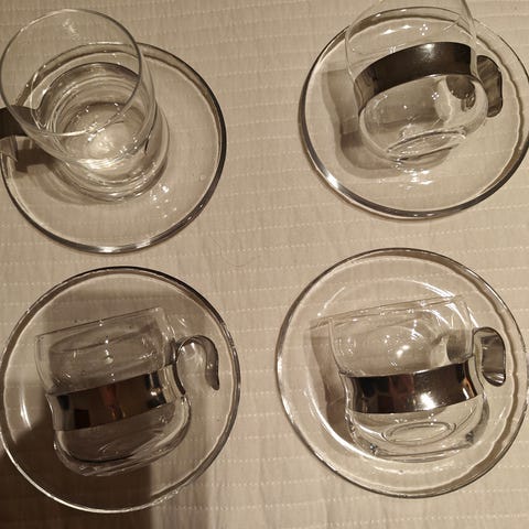 Iittala Paula lasit. 4 kpl 17cl ja 3 kpl 14cl. 6 kpl aluslautasia ja lisäksi 4 ylimääräistä teräspidikettä. Myydään kokonaisuutena.