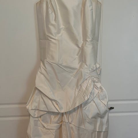 Ompelijalla teetty juhlapuku xs-s koolle sopiva. Edessä helmikirjailut. Täyspitkä. Silkkiä. Mukaan kiinnitettävät olkaimet.