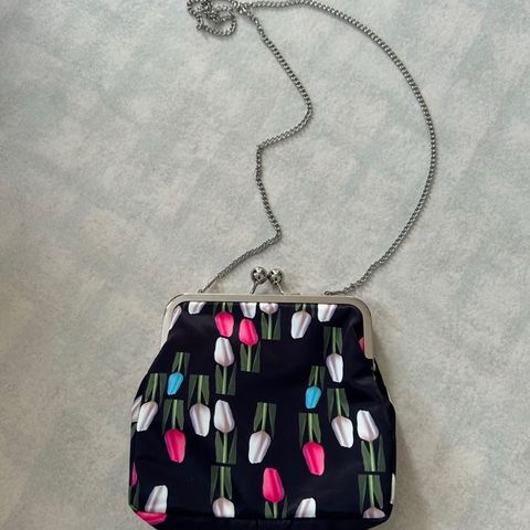 Ivana Helsinki, Paola Suhonen, kankainen, tulppaanikuvioinen olkalaukku. Mitat 19 cm, 17 cm ja 7 cm.