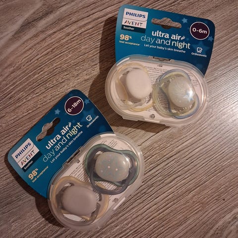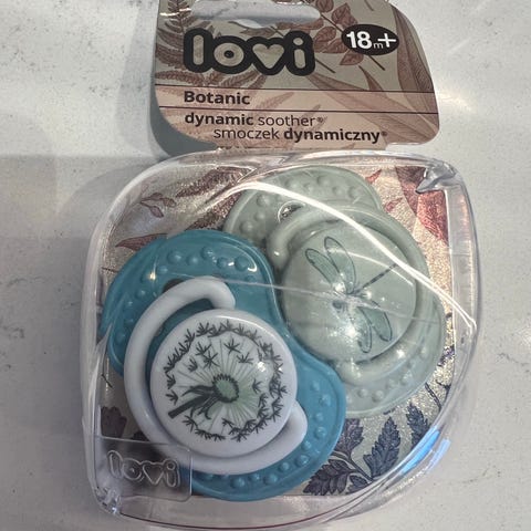 Lovin käyttämättömät tutit 0-2 kk vanhoille vauvoille (tai pidempäänkin). Toisessa pimeässä hohtava osa. Tämä tutti malli jäi meillä käyttämättä.