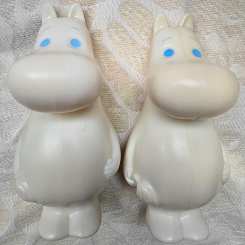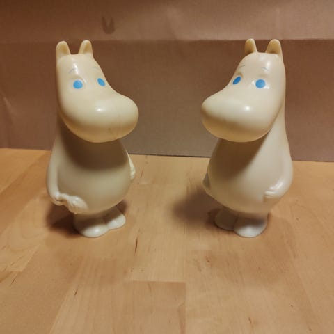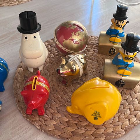 Muumipappa säästöpankki 2kpl (takana teksti Helsinginpankki, palvelupankki), ehjiä, toisessa jotain pientä jälkeä vaan.