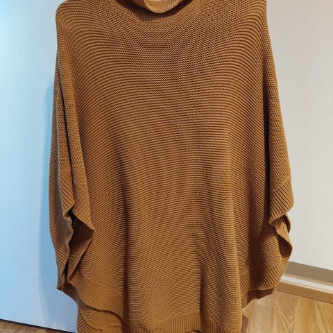 Mustavalkoinen poncho. Jäänyt käyttämättömäksi. 100% akryyliä. Sijaitsee Päkinmäellä.