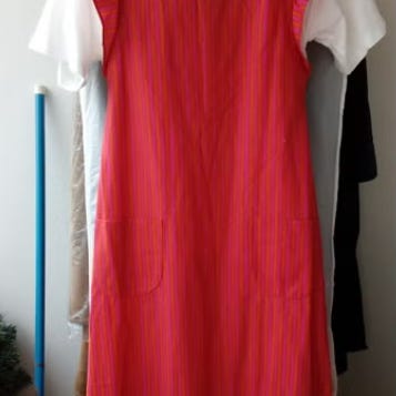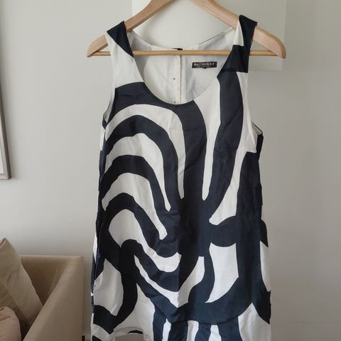 Marimekko Samu-Jussi Kosken suunnittelema mekko vuosien takaa, koko 36. Hyväkuntoinen ja siisti mekko edelleen. Irrallinen vyö ja taskut. Tumma väri näyttää jossain valossa tuottavan hieman vihreään ja toisessa valossa taas mustaan.