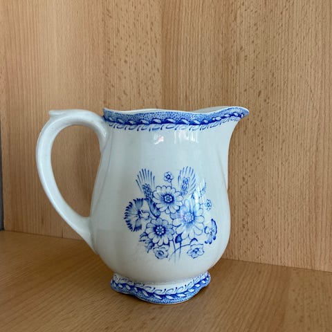 Kannu yleisilmeeltään siistikuntoinen, pohjan reunoissa hieman tummentumaa ja nokassa pienenpieni lohkeama. Korkeus noin 19 cm.