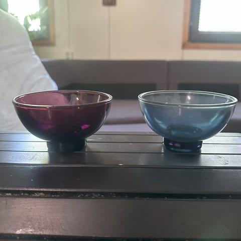 Karhula-Iittala jälkiruokakulho 6 kpl. Siniharmaa. Halkaisija n. 10 cm ja korkeus 5,5 cm. Suunnittelija Saara Sappinen. Myydään kokonaisuutena.