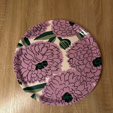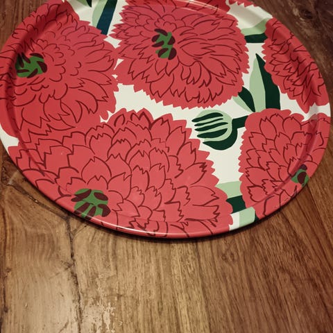 Uusi (vielä suojamuoveissaan) tarjotin, halkaisijaltaan 34 cm. Punainen Marimekon Primavera. Nouto Nokialta.