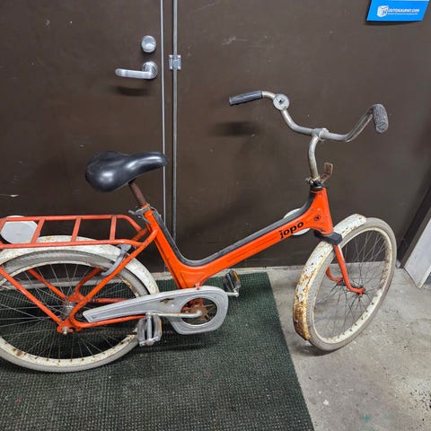 Myydään vihreä 22-tuumainen peltijopo. Periaatteessa kaikki olennainen tallessa, mutta vaatii täydellisen huollon. Ollut kaupunkikäytössä 10 vuotta sitten ja sen jälkeen ollut sisällä säilytyksessä kunnes unohtunut ulkokatokseen, jossa ruoste on päässyt nakertelemaan enemmän.