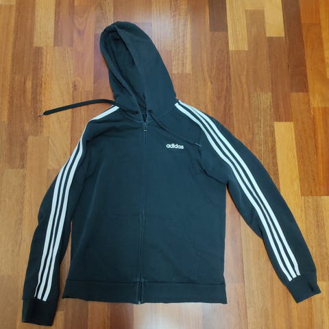 Ehkä Adidas-huppari, edessä pieni vetoketjutasku isomman taskun lisäksi. Hupparissa muutama tahra, jotka eivät tavallisessa pesussa lähde (kts. kuvat), pientä nukkaantumista myös. Tahrat ja nukka ei näy normaalilta puhe-etäisyydeltä.