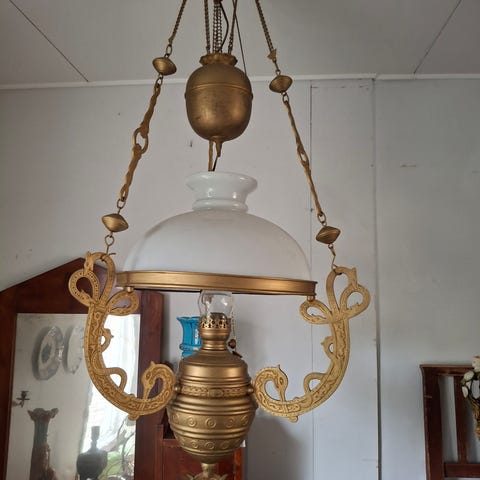Vanha kruunu. Lasikuvut paksua lasia. Painoa kruunulla melkoisesti. Viisi valopistettä.