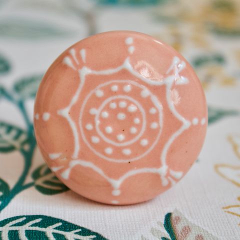 Valkoinen kukan/ruusunmuotoinen keramiikkanuppi. Jokainen omanlaisensa.
