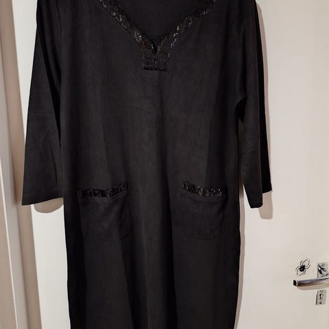 Musta olkaimeton trikoomekko, jossa edessä kaunis kuvio. Hyvin vähän käytetty, joten on kuin uusi.