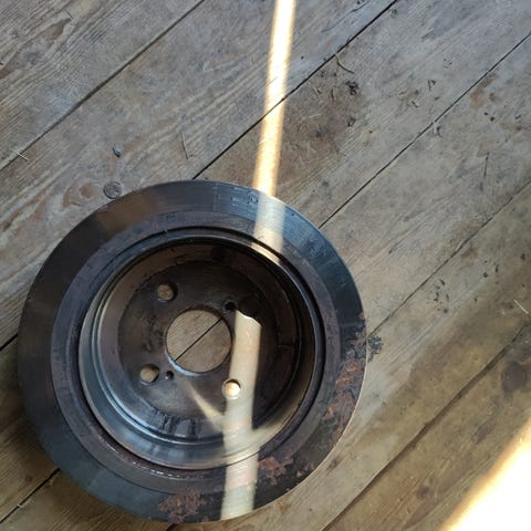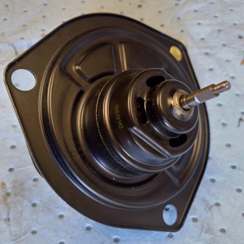 Moottori irtaallaan. Lohkossa reikä. Melkein kaikki osat löytyy.