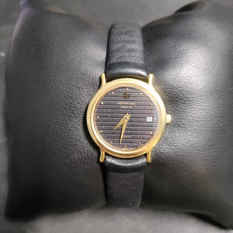Raymond weil 5600 kvartsi kello. Hyvässä kunnossa. Patteri vaihdettu. Lasissa pientä jälkeä. Nahkaranneke ei ole alkuperäinen ja siinä pieni jälki.